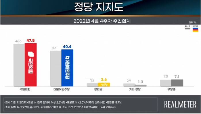 정당 지지도는 국민의힘이 지난 4월 3주차 주간 집계 대비 0.9%P 높아진 47.5%, 더불어민주당은 1.3%P 높아진 40.4%, 정의당은 0.4%P 높아진 3.6%를 기록하였다. 무당층은 0.1%P 증가한 7.1%로 조사됐다.