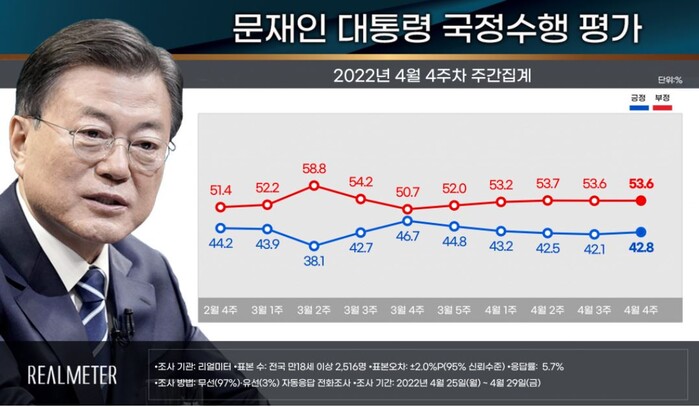문재인 대통령의 국정 수행 지지도(긍정 평가)에서는 지난 4월 3주차 주간 집계 대비 0.7%P 높아진 42.8%(매우 잘함 26.2%, 잘하는 편 16.6%)로 나타났다.