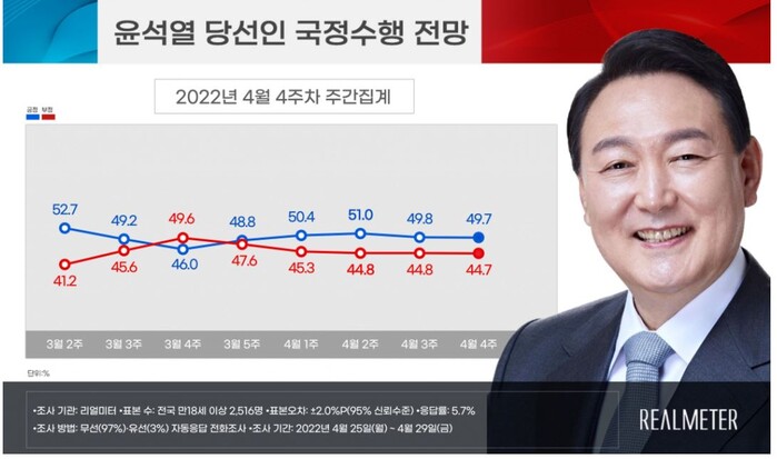 윤석열 당선인 국정수행 전망 일간 지표는 지난주 금요일(22일) 50.3%(부정적 전망 44.5%)로 마감한 후, 26일(화)에는 48.0%(2.3%P↓, 부정적 전망 46.8%), 27일(수)에는 49.0%(1.0%P↑, 부정적 전망 45.1%), 28일(목)에는 51.1%(2.1%P↑, 부정적 전망 43.0%), 29일(금)에는 50.7%(0.4%P↓, 부정적 전망 43.8%)의 흐름을 보였다.