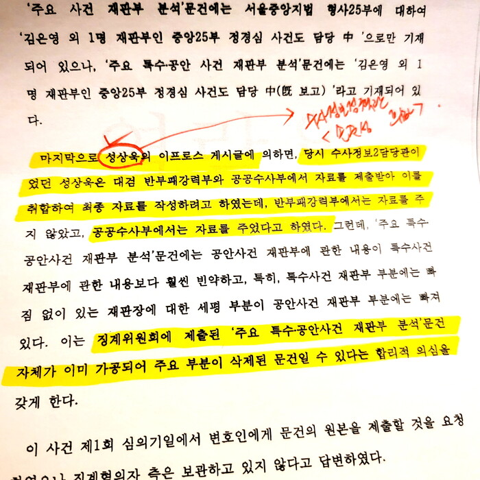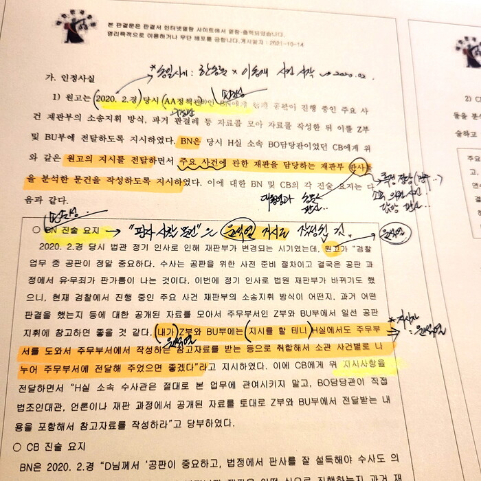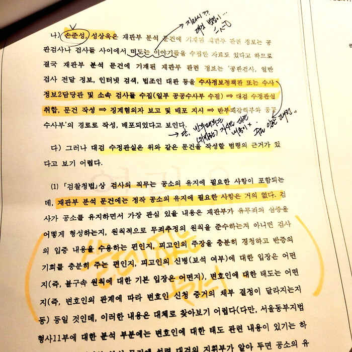 누적된 절차의 보고/지시체계였던 것입니다. 재판과정에 현출이 되어 인정된 내용이지요. 아래의 내용에 함께 등장하던 '성상욱 검사' 역시 그 체계 속에 있던 손준성 수사정보정책관의 휘하 검사이고, 이번에도《입건》된 피의자이기도 합니다.