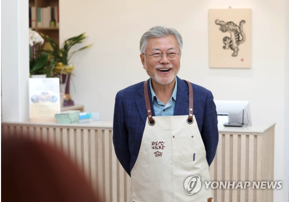 | ▲ 문재인 전 대통령이 26일 오후 경남 양산시 하북면 자신의 책방 '평산책방'에서 앞치마를 착용하며 밝은 표정을 짓고 있다. 2023.4.26 (사진=연합뉴스) |