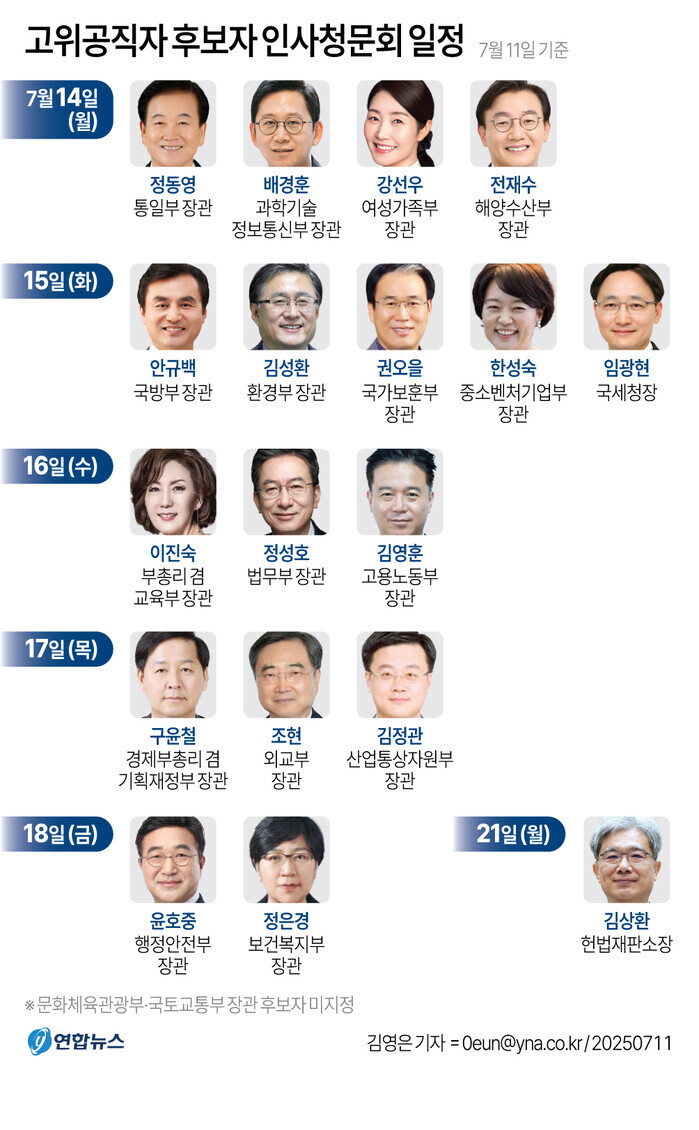 이후 17일에는 조현 외교부·김정관 산업통상자원부·구윤철 기획재정부 장관 후보자가, 18일에는 윤호중 행정안전부·정은경 보건복지부 장관 후보자가 연이어 검증대에 오른다.