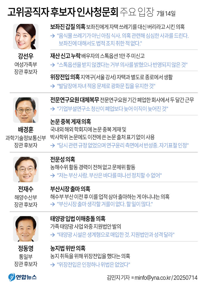 이 외에도 권오을 국가보훈부 장관 후보자에 대해서는 보훈 분야 경력 부족과 논문 표절 의혹 등이, 김성환 환경부 장관 후보자와 임광현 국세청장 후보자에 대해서도 각각 정책 역량과 도덕성에 대한 검증이 이루어졌다.