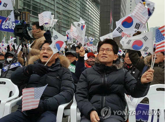 | ▲ 윤석열 탄핵반대 집회에서 태극기 흔드는 윤상현과 김문수. 사진은 2017.2.4 (사진-연합뉴스) |