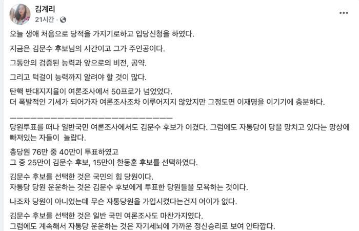 김 변호사는 국민의힘에 입당한 이유에 대해 "김문수 후보의 검증된 능력과 앞으로의 비전, 공약, 그의 턱걸이 능력까지 알려야 할 것이 많기 때문이다"고 설명했다.