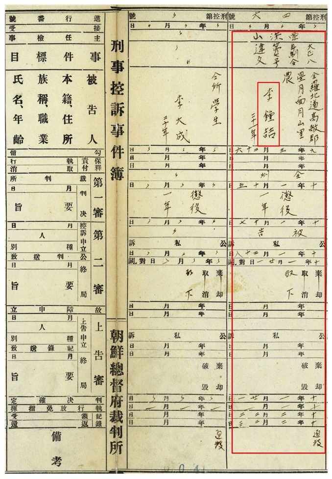 「형사공소사건부」. 이종철 선생이 1심 재판에서 대정8년 제령 제7호 위반으로 징역 1년을 받았음을 보여준다.