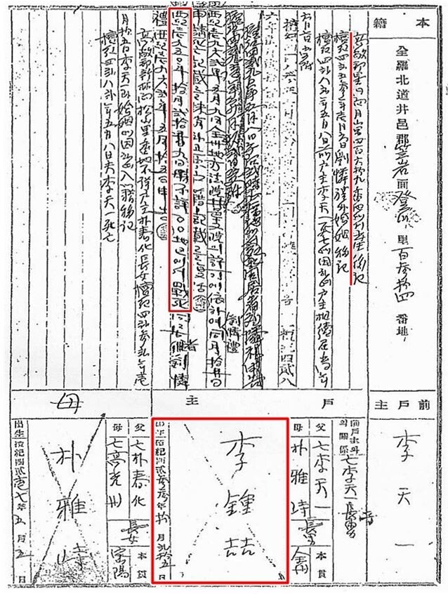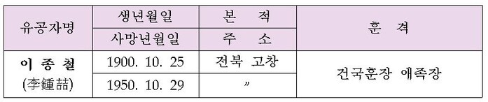 이종철 선생의 「제적부」. 이종철 선생이 1900년 10월 25일 고창군 성내면 월산리 469번지에서 출생하고, 6.25전쟁 기간인 1950년 10월 29일 ‘전사’했음을 보여준다.