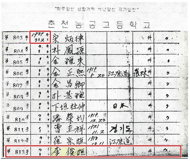 | 이준환(이효선 선생의 이명) 선생이 1939년 3월 2일 춘천농업학교를 졸업 |
