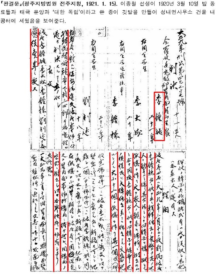 「판결문」(광주지방법원 전주지청, 1921. 1. 15). 이종철 선생이 1920년 3월 10일 밤 동료들과 태극 문양과 ‘대한 독립’이라고 쓴 종이 깃발을 만들어 성내면사무소 건물 내 공터에 세웠음을 보여준다.