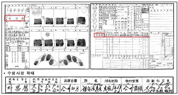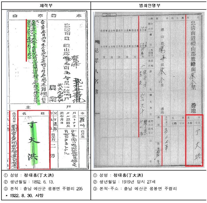 정대홍 선생의 「범죄인명부」와 「제적부」. 정대홍 선생이 출옥한지 1년 2개월 만인 1922년 8월에 사망했음을 보여준다.