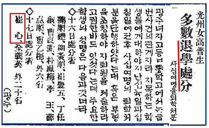 | 조선일보(1930. 1. 20). 최심 선생이 광주여자고등보통학교 재학 중 광주학생운동에 관계하여 1930년 1월 17일 퇴학 처분을 받았음을 보여준다. |
