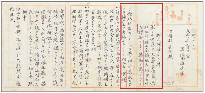 오늘(1919. 3. 28) 오전 7시 반 천안군 양대(良垈)헌병주재소에 직산금광(稷山金鑛) 갱부 약 150명이 몰려와 폭동을 일으킴에 따라 발포 해산시켰는데 그 결과 폭동 참가자 3명을 체포하고 6명이 부상을 입고 그 중 3명은 중상