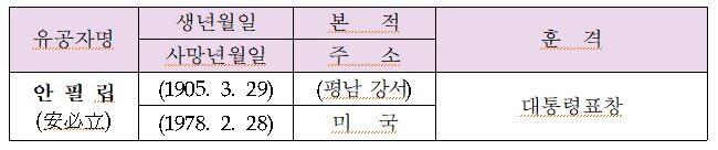 국가보훈처(처장 황기철)는 제76주년 광복절을 맞아 1919년 충남 천안에서 광부들의 만세시위를 이끈 박창신 선생과 도산 안창호 선생의 장남으로 미국에서 대를 이어 독립운동에 앞장선 안필립 선생 등 247명을 독립유공자로 포상한다고 밝혔다.