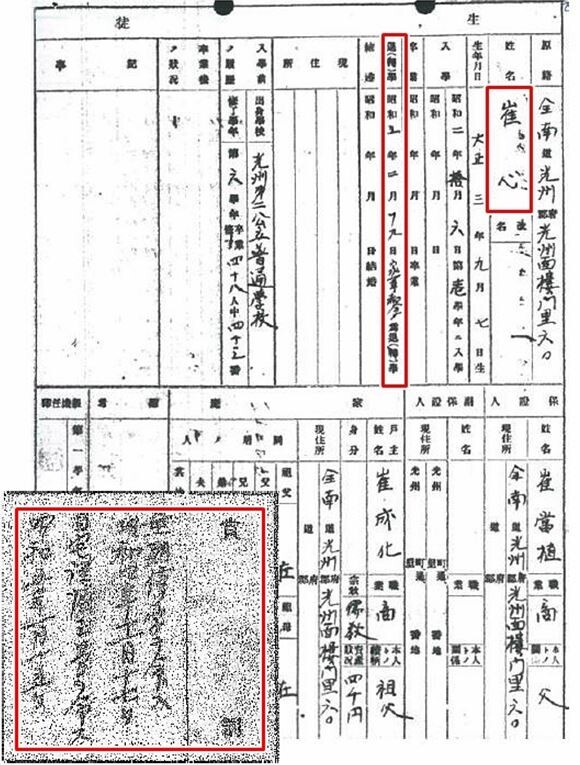 최심 선생이 광주여자고등보통학교 재학 중이던 1930년 2월 19일 ‘가사’ 사정으로 퇴학했다고 기록되어 있다. 하지만, 조선일보(1930. 1. 20) 기사에 따르면, 퇴학 사유는 ‘가사’가 아니라 광주학생운동 참가 사실이었다. |