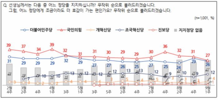 조국혁신당은 3%포인트 오른 12%로 나타났다. 민주당 이탈자들을 흡수한 양상으로 해석되며 개혁신당 4%, 진보당 1%, 없다+모름/무응답을 합한 비율은 28%로 늘어났다.