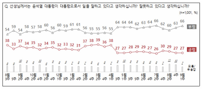 엠브레인퍼블릭‧케이스탯리서치‧코리아리서치 인터내셔널‧한국리서치 4개사가 시행해 발표하는 전국지표조사(NBS, National Barometer Survey) 결과 윤석열 대통령의 국정운영 지지율은 '긍정' 27%, '부정' 66%로 나타났다.