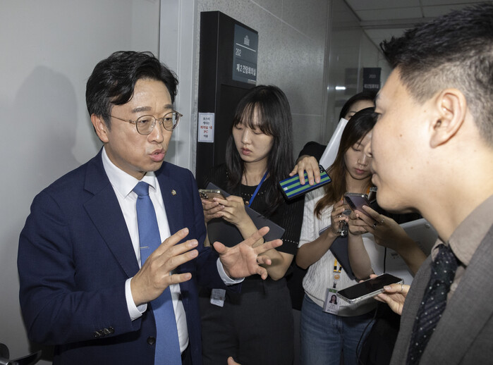 | ▲ 더불어민주당 검찰 개혁 특별위원회 사인 이용우 의원이 26일 국회 의원회관에서 열린 특위 회의 도중 취재진에게 진행 상황에 대해 설명하고 있다. 2025.8.26 (사진=연합뉴스) |