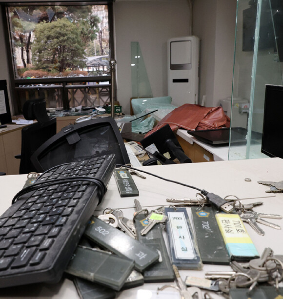 | ▲ 19일 서부지법 내부로 난입한 폭도들 때문에 사무실과 집기류가 파손된 사무실 내부 (사진=연합뉴스) |