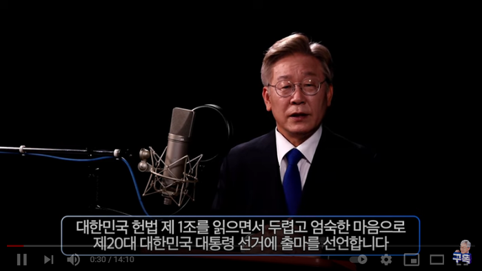 이 지사는 '대한민국의 주권은 국민에게 있고 모든 권력은 국민으로부터 나온다'라는대한민국 헌법 1조를 읽으며 "두렵고 엄숙한 마음으로 20대 대통령 선거 출마를 선언한다"라고 말문을 열었다.