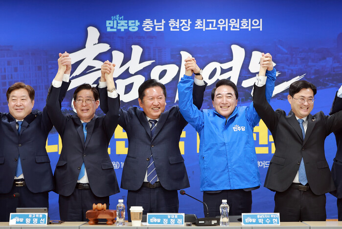 민주당 지도부는 20일 보령머드테마파크에서 최고위원회의를 개최하고 충남 지역 선거 전략을 점검했다. 이날 회의에는 정청래 대표와 지도부, 그리고 충남지사 후보로 확정된 박수현 후보 등이 참석했다.