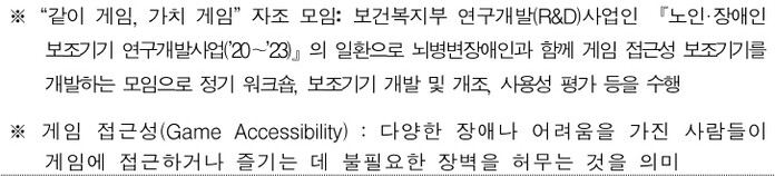 게임 접근성 보조기기 : 기존의 게임기기, 게임콘텐츠에 장애인이 접근 가능할 수 있도록 도와주는 인터페이스 기기(개발·개조·제작·적용 포함)