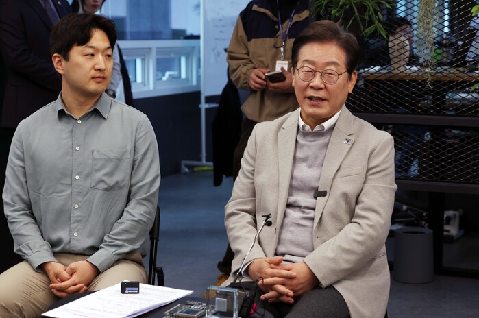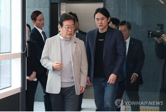 | ▲ 14일 서울 강남구 퓨리오사AI에서 백준호 대표와 회사를 둘러보는 이재명 더불어민주당 대선 예비후보 (사진=연합뉴스) |