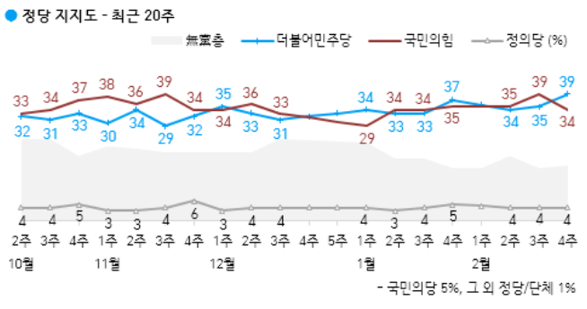 정당 지지도, 민주당 39% 국민의힘 34%..전주 대비 민주당 4%p 상승, 국민의힘 5%p 하락.