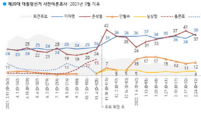 지난주 갤럽 조사에 비해 이 후보(34→38%)는 4%포인트 오른 반면 윤 후보(41→37%)는 4%포인트 하락하면서 윤 후보의 7%포인트 우세에서 이 후보가 오차범위 내인 1%포인트 앞서는 접전 판세로 바뀌었다. 안 후보는 1%포인트 상승하면서 하락세가 멈췄고, 심 후보는 지난주와 지지율이 같았다.