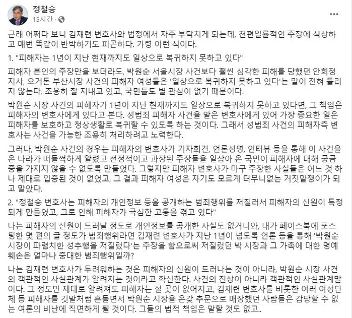 정 변호사는 "나는 피해자의 신원이 드러날 정도로 개인정보를 공개한 사실도 없거니와, 내가 페이스북에 포스팅한 몇 편의 글 정도가 범죄행위라면 김재련 변호사가 지난 1년이 넘도록 언론 등을 통해 '박원순 시장이 파렴치한 성추행을 저질렀다'는 주장을 함으로써 저질렀던 박 시장과 그 가족에 대한 명예훼손은 얼마나 중대한 범죄행위일까?"라고 따져 물었다.