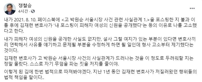 24일 오전 정 변호사는 SNS를 통해 피해자 측 김재련 변호사가 자신을 형사고소했다는 사실을 전했다. 정 변호사는 "김재련 변호사가 고 박원순 서울시장 사건의 사실관계가 드러나는 것을 이 정도로 두려워할 지는 정말 몰랐다. 스스로 자기 무덤을 파는 짓을 저지를 줄이야"라고 개탄했다.