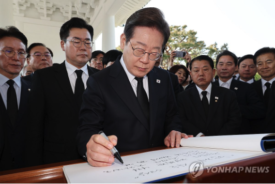 | ▲ 28일 서울 동작구 국립서울현충원에서 방명록 작성하는 이재명 대선 후보 (사진=연합뉴스) |