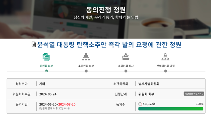 윤석열 탄핵 국회청원은 종료일인 7월 20일까지 동의할 수 있다.