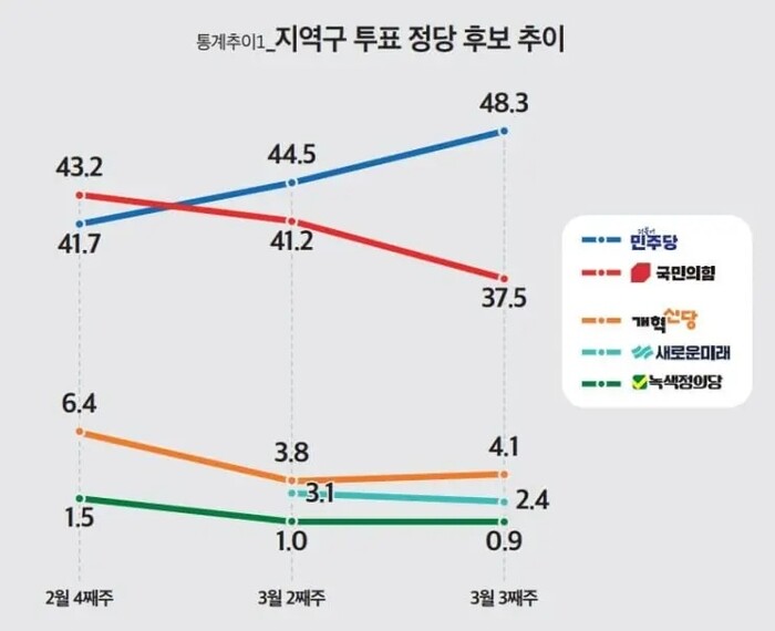 양당 간 격차가 오차범위 밖으로 벌어진 것은 지난 1월27~28일 조사(민주당 44.8% 대 국민의힘 38.5%) 이후 6주 만이다