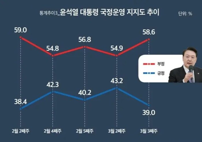 3월 세째주 대통령 국정수행능력 평가에서는 긍정평가가 4.2%p 급락하면서 39%로 조사됐고 부정평가의 경우 58.6%로 3.7%p 올랐다.
