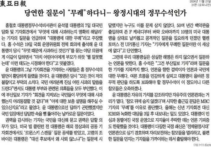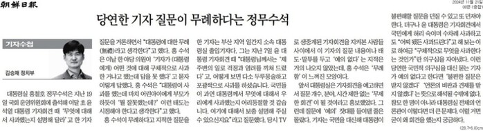 비판이 쇄도하자 홍 수석이 이틀 만에 사과했지만 대통령실의 현실 인식이 얼마나 시대착오적인지 보여주는 단편적인 사례이다. 대통령이 국민과의 대담을 하면서 기자들이 자유롭게 질문하는 자리에서 조차 질문에 '무례했다'고 공식석상에서 비판한 것은 언론의 비판과 견제를 거부한다는 뜻일 수 밖에 없다.