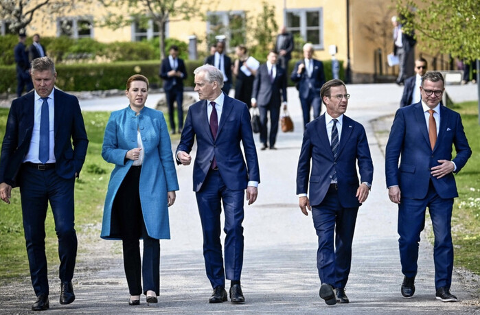 | ▲왼쪽부터 아이슬란드 총리, 덴마크 총리, 노르웨이 총리, 스웨덴 총리, 핀란드 총리 (사진=연합뉴스) |