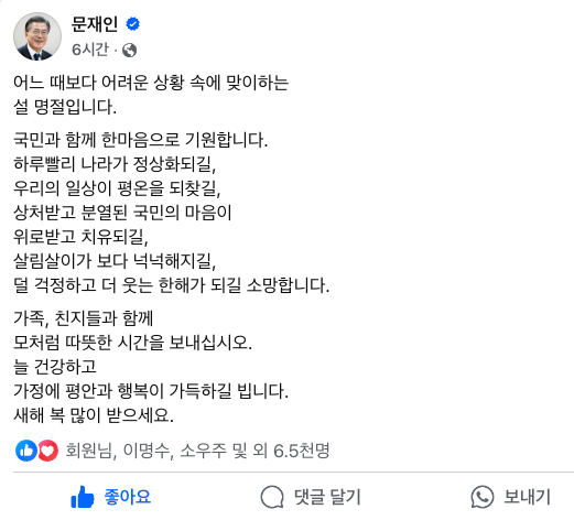 문 전 대통령은 27일 자신의 페이스북에 "어느 때보다 어려운 상황 속에 맞이하는 설 명절"이라며 "덜 걱정하고 더 웃는 한해가 되길 소망한다"고 말했다.
