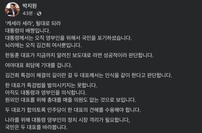 박 의원은 "한동훈 대표가 지금까지 알려진 보도대로라면 성공적이라 판단한다"며 윤한 회동때 '김건희 3대 요구' 등을 한 한 대표를 치켜세운 뒤, "여야대표 회담에 기대를 건다"고 적었다.