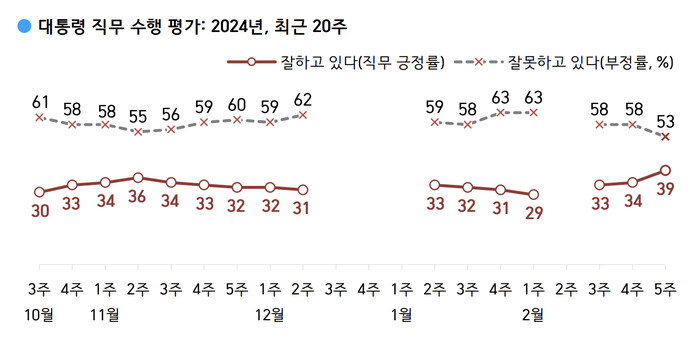 대통령 국정수행능력 부정평가는 5%포인트 떨어진 53%로 윤 대통령 지지도가 40%에 육박한 것은 지난해 7월 첫째 주(38%)이래 거의 8개월만이다.
