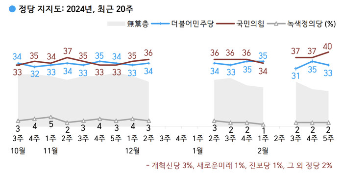 다른 여당의 지지율은 개혁신당 3%, 녹색정의당 2%, 새로운미래와 진보당 각각 1%, 그 외 정당 2%, 지지하는 정당 없는 무당층은 19%로 조사됐다.