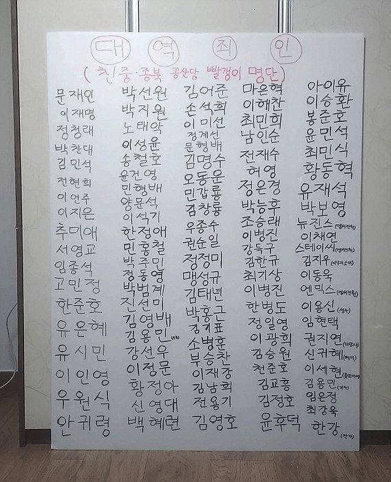 공개된 게시글에는 '대역죄인(친중·종북 공산당 빨갱이 명단)'이란 제목이 빨간 글씨로 적혀있다. 그 아래에는 문재인, 이재명, 정청래, 박찬대 등 전직 대통령부터 현직 더불어민주당 소속 의원들의 이름이 나열되어 있다.