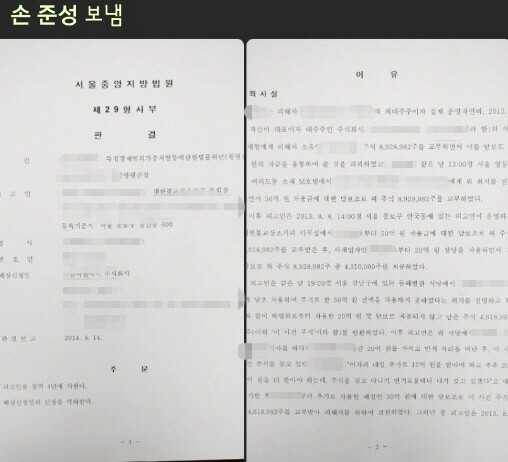 | ▲지난해 4월 3일 김 의원이 A씨에게 보낸 지모씨의 실명 판결문 사진파일. 메시지 상단에 '전달된 메시지, 손준성 보냄'이라고 적혀있다. (사진=뉴스버스) |