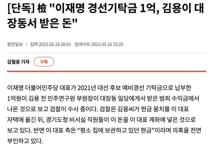 지난 16일 중앙일보는 '익명 검사’발 소식으로 ‘[단독] 검찰 이재명 경선기탁금 1억, 김용이 대장동서 받은 돈’이라는 기사를 송출했다. 이재명 더불어민주당 대표가 2021년 대선 후보 예비경선 기탁금으로 납부한 1억원이 김 전 부원장을 통해 받은 것이라는 주장이다.