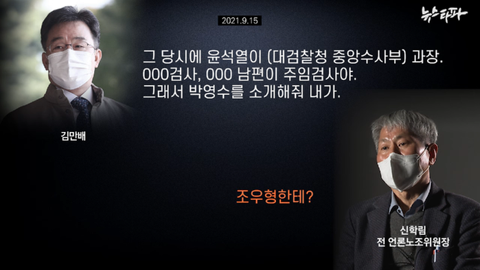 "인터넷 매체 뉴스타파는 6일 <[김만배 음성파일]”박영수-윤석열 통해 부산저축은행 사건 해결”>이란 기사를 음성 녹음 파일과 함께 보도했다. 통화는 김만배씨와 ‘신학림’이라는 사람 간 대화였다. 뉴스타파는 기사에서 “김만배씨가 한 지인과 나눈 대화의 음성 파일을 뉴스타파가 입수했습니다. 대화 당사자는 현직 기자 시절 김씨와 동료 사이였던 신학림 전 언론노조 위원장”이라고 했다. 외부에서 제3자로부터 ‘제보’를 받은 것처럼 신씨를 소개한 것이다.