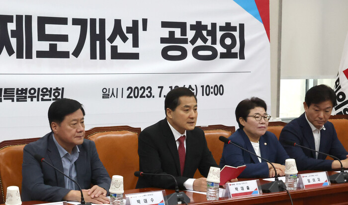 국민의힘 박대출 정책위의장은 12일 당 노동개혁특별위원회가 연 실업급여 제도개선 민당정 공청회를 마친 뒤 "실업급여 하한액을 낮추거나 폐지하는 방안을 포함해 근본적인 제도 개선이 필요하다는 방향에 공감했다"고 말했다.