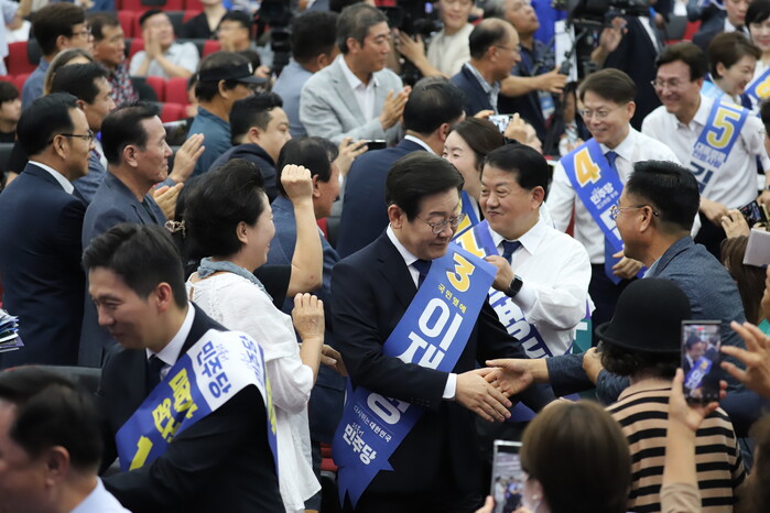 | ▲당원들과 인사 나누는 이재명 후보 (사진=시사타파뉴스 박성규) |