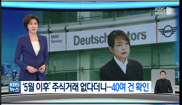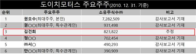 실제로 도이치모터스의 2010년 5월 분기보고서에 따르면, 2010년 3월 기준 도이치모터스의 발행주식 1900만주에서 권오수 회장 등 2인이 총 주식의 44.1%를 보유하고 있고, 김건희씨는 유통주식의 7.5%에 해당하는 지분을 갖고 있었다.