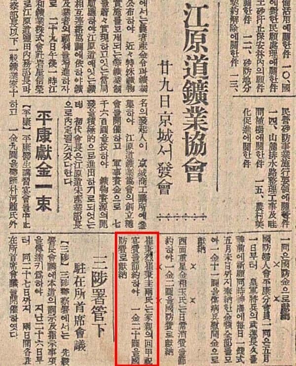 | ▲1938년 6월 30일 최재형 전 감사원장 조부 최병규가 일제에 국방헌금을 헌납한 '매일신보' 기사 |