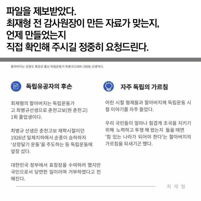 그는 "파일을 제보받았다. 최재형 전 감사원장이 만든 자료가 맞는지, 언제 만들었는지 직접 확인해 주시길 정충히 요청드린다"라며 다음과 같은 내용의 게시물을 올렸다. 게시물을 보면 최 전 원장의 조부가 대한민국 표창장도 거부한 독립운동가로 묘사되어 있다.
