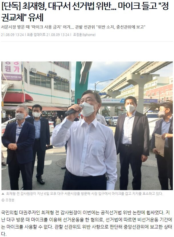 한편 판사 출신 최 전 원장이 이번에는 공직선거법 위반 논란에 휩싸였다. 지난 대구 방문 때 마이크를 이용해 선거운동을 한 혐의로, 선거법에 따르면 비선거운동 기간에는 마이크를 사용할 수 없다. 관할 선관위도 위반 사항으로 판단해 중앙선관위에 보고한 상태다.